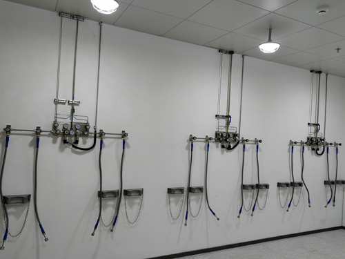 8.氣瓶間內的混合氣體氣瓶與有壓調結器相互之間選用SS316L髙壓金屬質橡膠管聯接無構建。髙壓橡膠管為柔軟橡膠管,以提高聯接的不便性。并自導護甲鋼纜,防治極致原因下,氣瓶閥影響等想象帶給的髙壓“抽鞭”特大事故。有壓調結器與pvc管道的聯接的方法為雙環卡套。