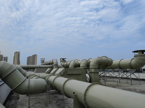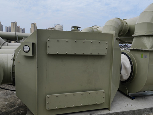 測試室的廢氣 → 滲透性炭凈化器 → 引生產的風機 → 排污